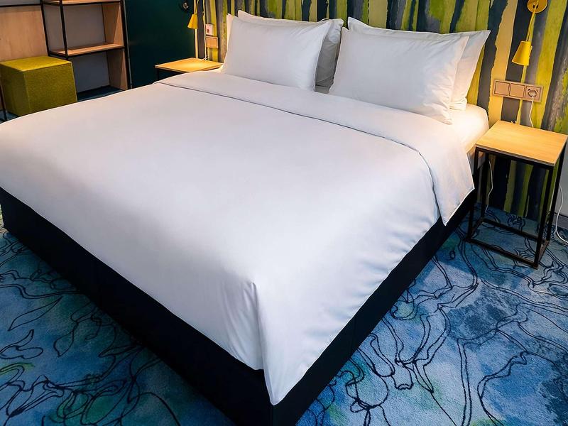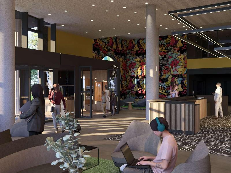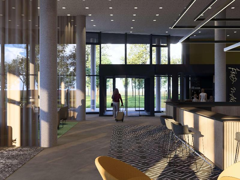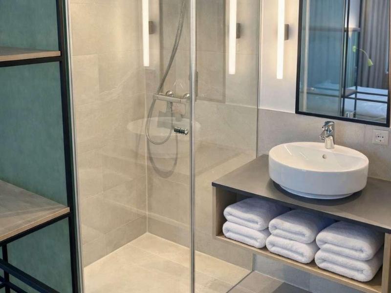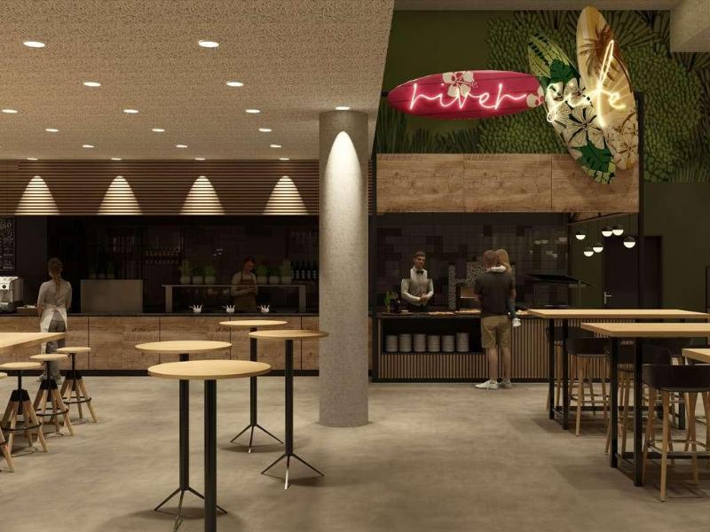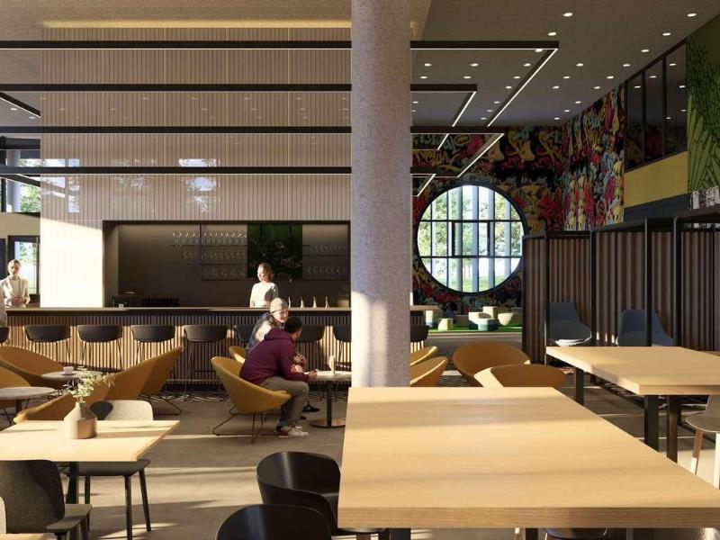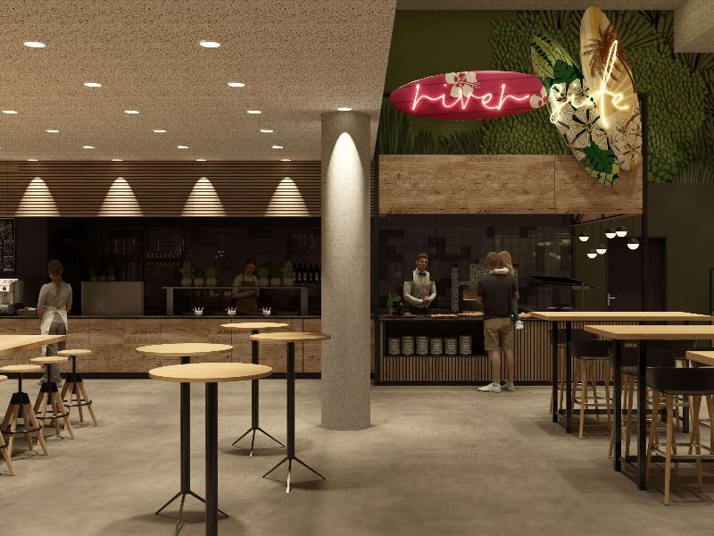 In the new ibis Styles directly at Munich Airport, you can expect a modern design inspired by the Isar river that embraces nature. Forest and water are the central themes, visible in the blue-green façade, which is reminiscent of the colors of Bavarian riparian forests. The open lobby located at the heart of the hotel is where you'll find our ISAR GARDEN restaurant with terrace, a bar, co-working spaces, food market, and children's area. The hotel also has a fully equipped fitness room.