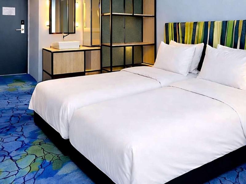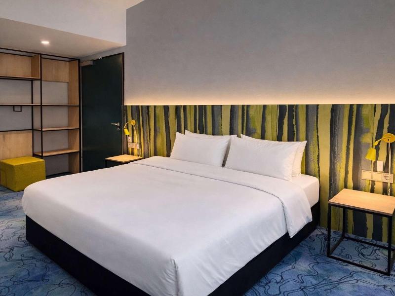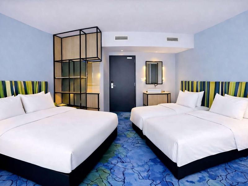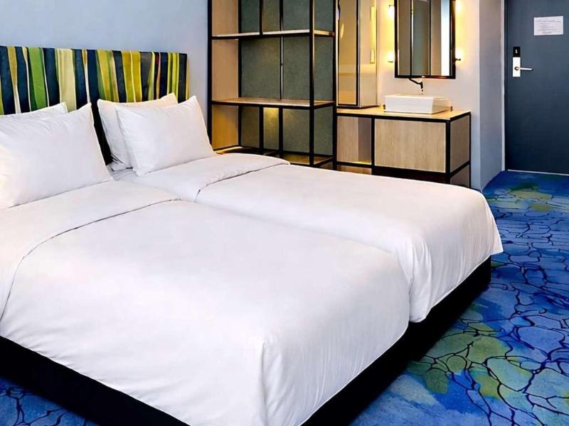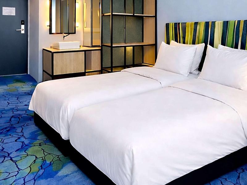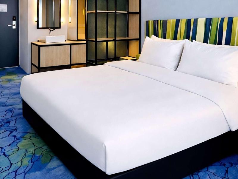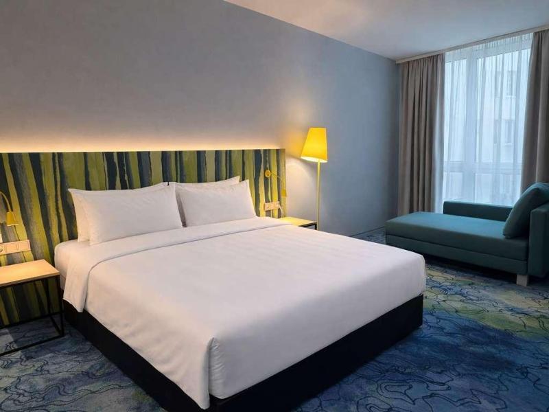 In the new ibis Styles directly at Munich Airport, you can expect a modern design inspired by the Isar river that embraces nature. Forest and water are the central themes, visible in the blue-green façade, which is reminiscent of the colors of Bavarian riparian forests. The open lobby located at the heart of the hotel is where you'll find our ISAR GARDEN restaurant with terrace, a bar, co-working spaces, food market, and children's area. The hotel also has a fully equipped fitness room.